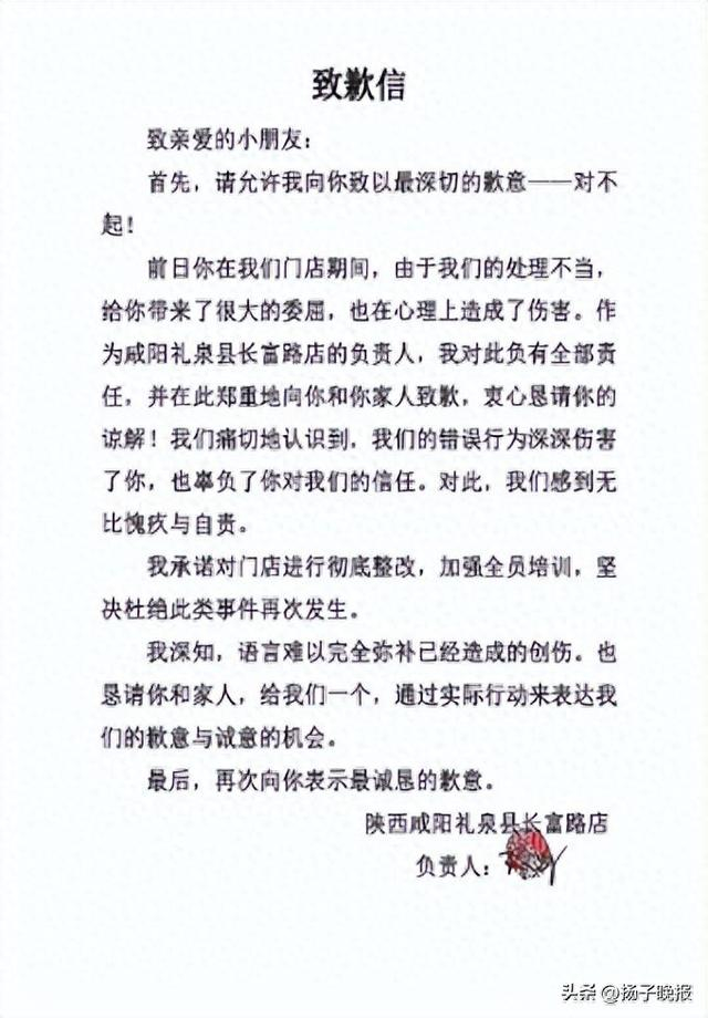 首先,请允许我向你致以最深切的歉意一一对不起!前日你在我们门店期间,由于我们的处理不当,给你带来了很大的委屈,也在心理上造成了伤害。作为咸阳礼泉县长富路店的负责人,我对此负有全部责任,并在此郑重地向你和你家人致歉,衷心恳请你的谅解!我们痛切地认识到,我们的错误行为深深伤害了你,也辜负了你对我们的信任。对此,我们感到无比愧疚与自责。我承诺对门店进行彻底整改,加强全员培训,坚决杜绝此类事件再次发生。我深知,语言难以完全弥补已经造成的创伤。也恳请你和家人,给我们一个,通过实际行动来表达我们的歉意与诚意的机会。最后,再次向你表示最诚恳的歉意。