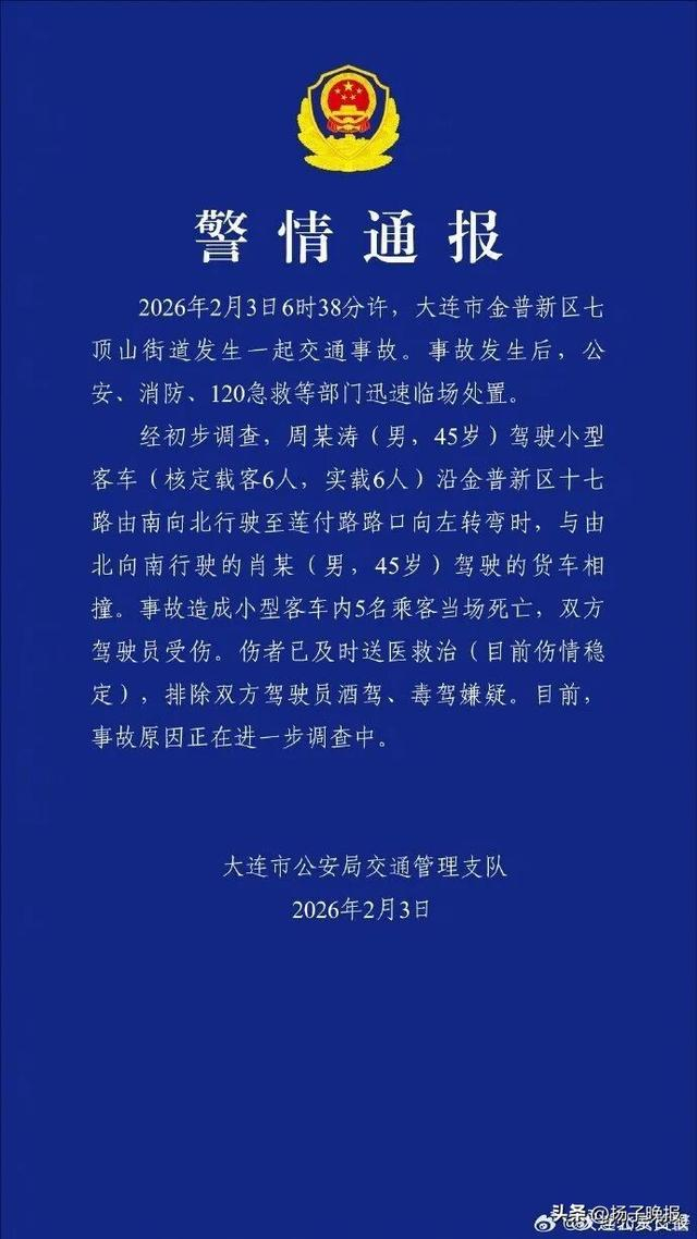 大连市公安局交通管理支队2026年2月3日通报:2026年2月3日6时38分许,大连市金普新区七顶山街道发生一起交通事故。事故发生后,公安、消防、120急救等部门迅速临场处置。