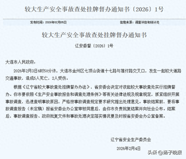 辽宁省应急管理厅官网2月5日消息,辽宁省安全生产委员会发布较大生产安全事故查处挂牌督办通知书指出,2月3日6时50分许,大连市金州区七顶山街道十七路与莲付路交叉口,发生一起较大道路交通事故,造成5人死亡,2人受伤。省安委会决定对该起较大事故查处实行挂牌督办。