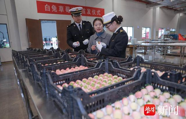 在句容白兔镇科创中心鲜果加工区,工人们正忙着分拣、包装刚采摘的草莓,随后整齐装入印有“莓好白兔”标识的包装盒。镇江海关工作人员全程驻场监管,严格把控采摘流程、果品质量及环境安全,为草莓销售保驾护航。本次白兔草莓销往香港的品种主要是粉玉和紫金香雪,数量是150公斤。江苏句容白兔草莓专业合作联社负责人侯蓉苗介绍说:“这次是采用陆运的形式,从白兔镇出发,开到深圳口岸过关到达香港,全程预计在30个小时左右。”