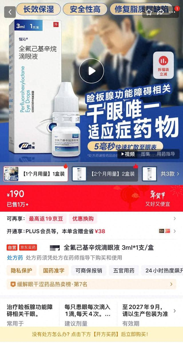 记者了解发现,目前大热的这款全氟己基辛烷滴眼液是2025年7月获批上市,其原理是药物迅速扩散至整个眼表与泪膜的亲脂部分相互作用,覆盖在泪膜水液层表面,稳定泪膜、防止泪液过度蒸发。2026年1月1日,该药物纳入医保目录。在网络售药平台上,3ml全氟己基辛烷滴眼液售价190元,比传统人工泪液价格高几倍。尽管如此,其销售仍然火爆,突破1W+。大部分购买者都表示“使用效果不错。”