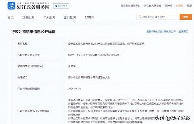 据浙江政务服务网显示,演员金晨因交通肇事逃逸被罚款1500元。