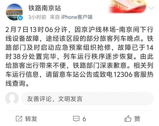 2月7日13时06分许,因京沪线林场-南京间下行线设备故障,途经该区段的部分旅客列车晚点。铁路部门及时启动应急预案组织抢修,故障已于14时38分处置完毕,列车运行秩序逐步恢复。由此给旅客出行带来不便,铁路部门深表歉意。相关列车运行信息,请留意车站公告或致电12306客服热线查询。