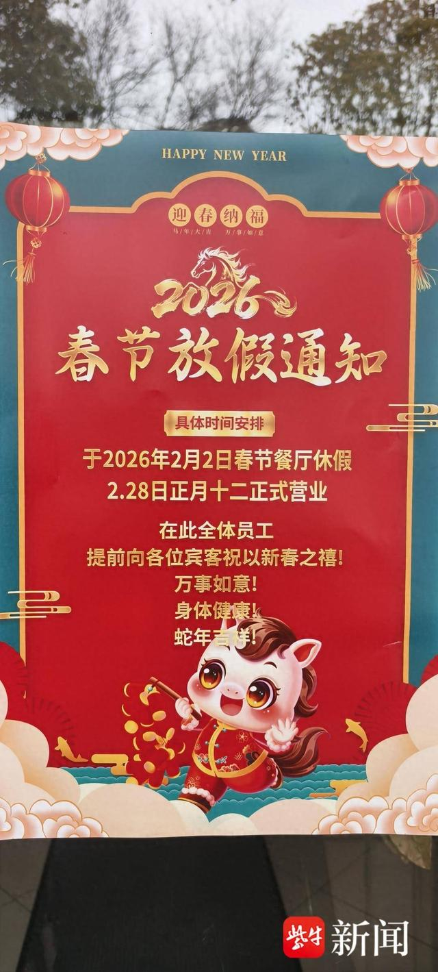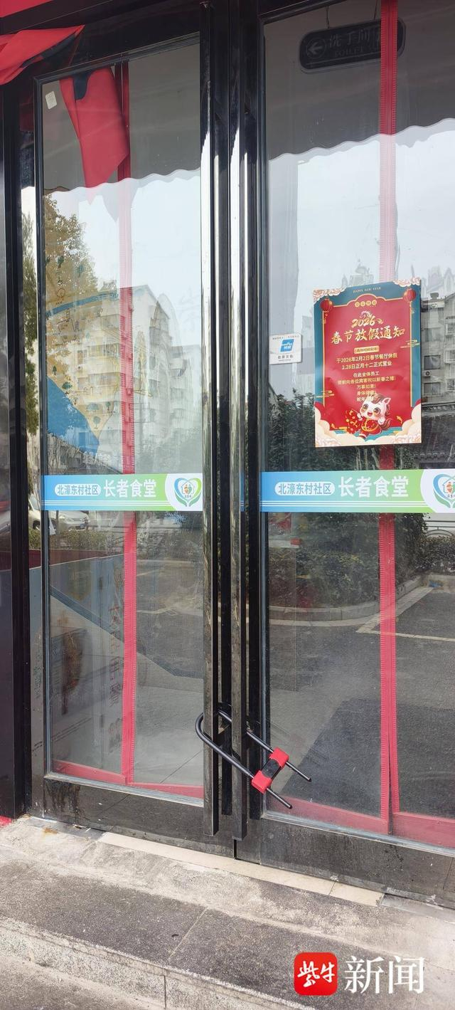 2月7日上午10点多,记者来到南通市崇川区和平桥街道北濠东村“北濠食光”社区食堂,该食堂大门紧闭,已经上锁,玻璃上贴着一张红色的告示:2月2日餐厅休假,2月28日正式营业,即总共放假26天。