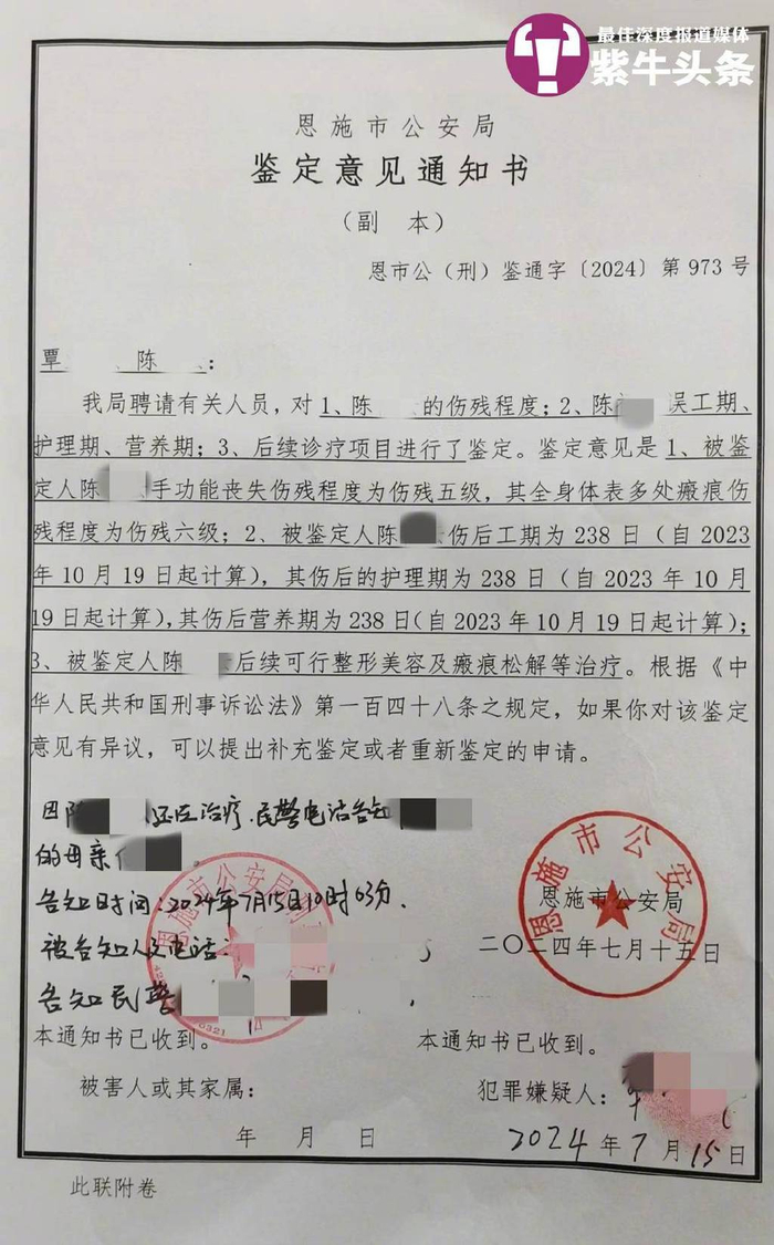 据恩施市公安局的伤情鉴定,小陈手功能丧失,程度达伤残五级,其全身体表多处瘢痕,伤残程度为伤残六级。案发后,覃某某被恩施市人民检察院以故意杀人罪提起公诉,检方建议刑期为十二年。2024年7月,恩施市人民法院开庭审理此案。