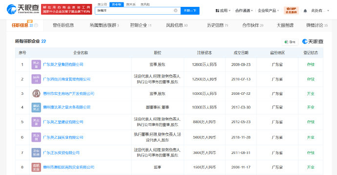商业履历信息显示,陈赐平名下关联22家企业,均为存续或开业状态,包括广东英之皇集团有限公司、广东纳百川商业管理有限公司、惠州市宏生房地产开发有限公司、广东正东投资有限公司等,版图涉及金融、地产等。其中20家企业为陈赐平、陈赐雄共同关联企业。