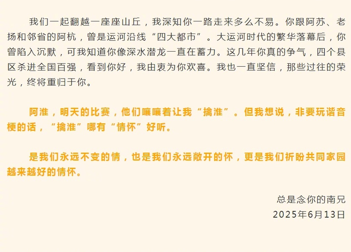 6月14日,“苏超”联赛战火重燃,南京队将客场挑战淮安队。6月13日晚,@南京发布 发文:阿淮,睡了吗?具体说了啥?请看下图,南京对淮安的夜间问候!