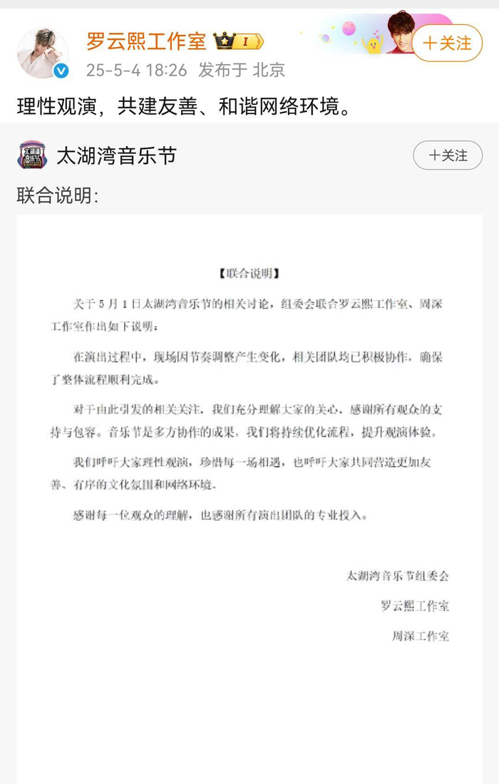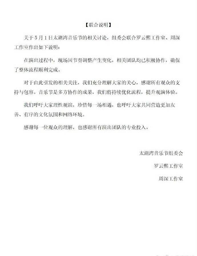 对于欣赏音乐节却因不和谐的声音带来的负面因素,音乐节超时变饭圈骂战,主办方迅速做出反应。5月4日晚,面对关于5月1日太湖湾音乐节的相关讨论,组委会联合罗云熙工作室、周深工作室作出如下说明:“在演出过程中,现场因节奏调整产生变化,相关团队均已积极协作,确保了整体流程顺利完成。对于由此引发的相关关注,我们充分理解大家的关心,感谢所有观众的支持与包容。音乐节是多方协作的成果,我们将持续优化流程,提升观演体验。我们呼吁大家理性观演,珍惜每一场相遇,也呼吁大家共同营造更加友善、有序的文化氛围和网络环境。感谢每一位观众的理解,也感谢所有演出团队的专业投入。”