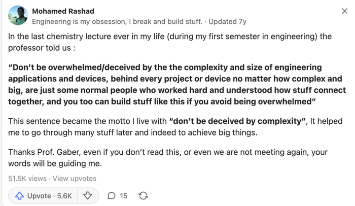 “不要被工程应用和设备的复杂性与规模吓倒或迷惑。无论一个项目或设备多么复杂、多么庞大,其背后都只是一些努力奋斗且懂得事物如何相互关联的普通人。只要你不被吓倒,你也能做出这样的东西。”