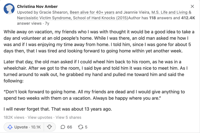外出度假时,和我同行的朋友们觉得花一天时间去养老院做志愿者会是个好主意。在那里时,一位老人问我近况如何,是否享受离家在外的时光。我告诉他,那时我已经离开了大约五天,感到疲惫,期待再过一周就能回家。