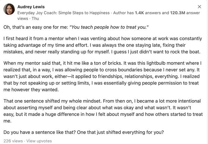 那句话彻底改变了我的思维方式。从那以后,我更加刻意地维护自己,明确什么可以接受、什么不能接受。这并不容易,但它极大地改变了我对自己的感受,以及别人对待我的方式。