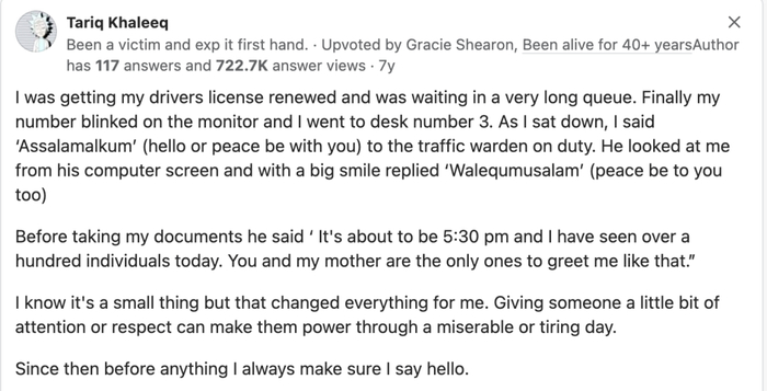 我知道这只是件小事,但对我来说却意义重大。给予别人一点关注或尊重,能让他们挺过糟糕或疲惫的一天。