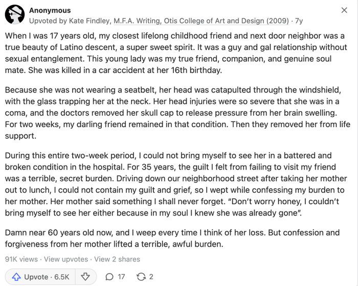 在我 17 岁的时候,我最亲密的童年好友和隔壁邻居是一位真正的拉丁裔美女,她非常温柔。我们只是男女关系,没有性纠葛。这位年轻女士是我真正的朋友、伙伴和真正的灵魂伴侣。她在 16 岁生日那天死于车祸。