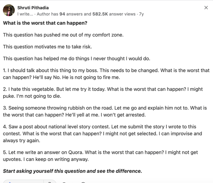 5. 让我在 Quora 上写一个答案。最坏的情况是什么?我可能得不到点赞。无论如何我都可以继续写下去。