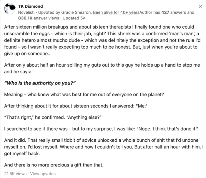 在经历了无数次分手和大约十六位治疗师之后,我终于遇到了一位能把 “碎鸡蛋重新拼好” 的人 —— 这本来就是他们的工作,对吧?这位心理医生是个典型的 “纯爷们”,绝对的直男,甚至有点过分 “男人”—— 这在我接触过的治疗师里绝对是例外,而非普遍现象 —— 所以说实话,我原本没抱太大期望。但就在你几乎要对某人放弃希望的时候……