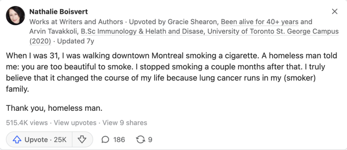 31 岁那年,我一边抽烟一边走在蒙特利尔市中心。一个流浪汉对我说:“你这么漂亮,不该抽烟的。”几个月后,我就戒烟了。我坚信,这改变了我的人生轨迹,因为我(吸烟者)家族中有人患肺癌。