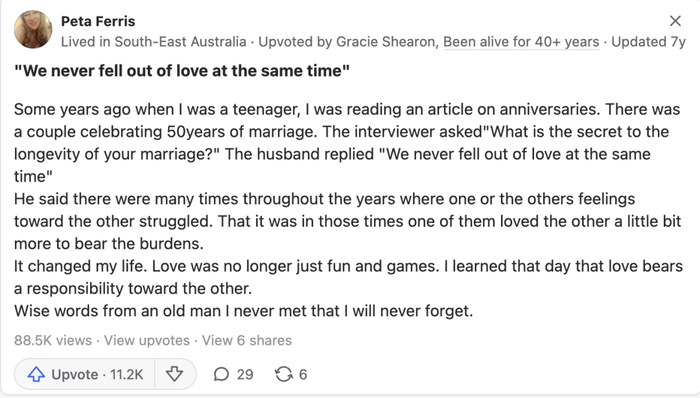 几年前,我还是个青少年时,读到一篇关于纪念日的文章。文中有一对庆祝结婚 50 周年的夫妇。采访者问:“你们婚姻长久的秘诀是什么?” 丈夫回答:“我们从未同时失去爱意。”