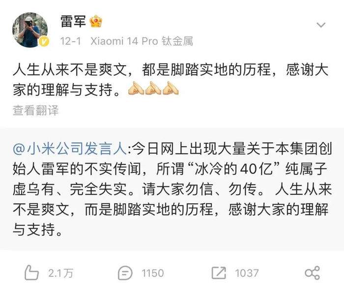 图源:微博@大象新闻而与此同时,雷军因小米集团股价大涨短暂登顶中国首富,网友调侃“雷军喜提一小时首富体验卡”。尽管后来雷军回应假新闻,但大家对此的真心祝贺和与有荣焉却是实实在在的。一直以来,雷军账号发布视频的评论区仿佛是一个巨大的许愿池,小到卫生巾,大到建房子,网友们对小米似乎有着一种天然的好感和信任。