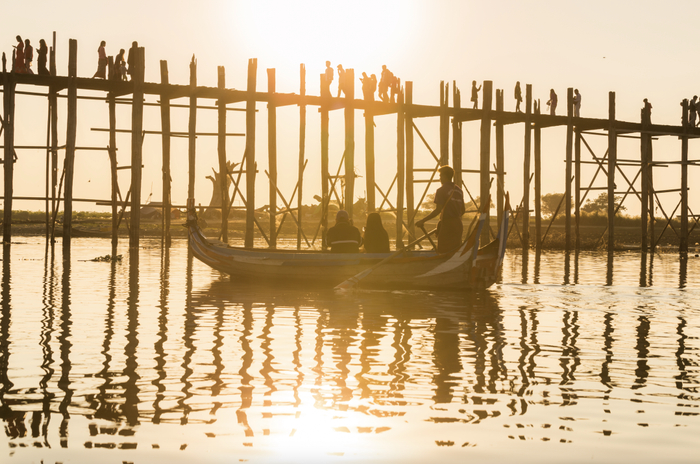 当落日余晖映照在水面,乌本桥将天空和水面衔接起来,头顶重物的缅甸女人、身穿红色僧服的僧人们从桥上经过,一切仿佛置于电影之中。以至于一种流传的说法是:在曼德勒,人们不是在乌本桥上,就是在去往乌本桥的路上。