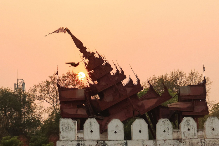 当地时间2025年3月31日,缅甸曼德勒,夕阳下,一只鸟飞过受损的曼德勒皇宫。(图/视觉中国)