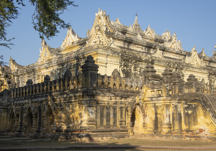 前面提到的黄寺,又称马哈昂美寺(Maha Aung Mye Bom),是因瓦古城内最大、保存最完整的寺庙,有逾200年的历史。作为曾经的皇家修道院,它是19世纪贡榜王朝的代表性建筑。其采用的是传统柚木寺院的七层结构,但是用砖头和灰泥材料建造,外层是淡黄色的涂料,因此也被称为“黄寺”。