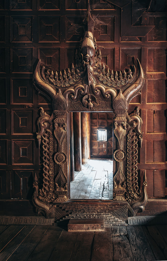 曼德勒皇宫呈正方形,有104个正殿,整体颜色以红色和金色为主,以精美的雕花著称。在建造材料上,它使用了世界上的著名木材之一——柚木。柚木被称为“万木之王”,有着很好的抗水性、耐久性,是缅甸的国树,也曾经是皇室尊贵的象征。