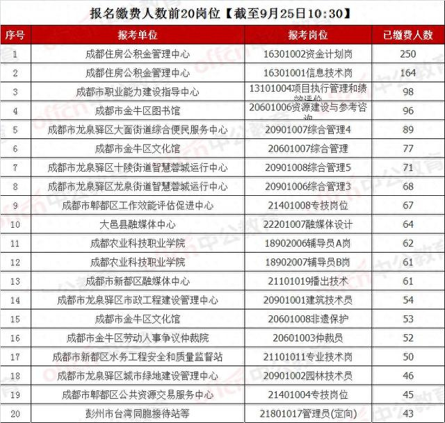 截至9月25日10:30点,成都全市共有4824人已缴费报名,还剩43个岗位“零”缴费,报名人数最多岗位来自成都住房公积金管理中心:16301002资金计划岗和16301001信息技术岗。