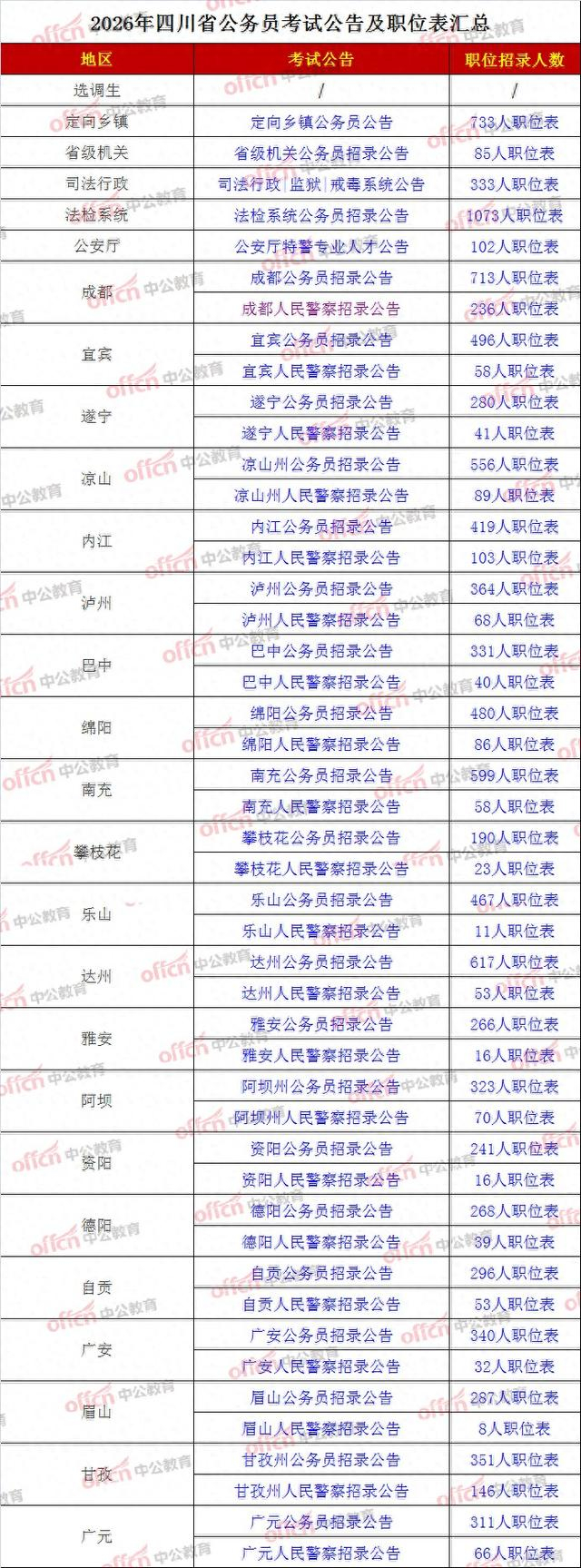 据悉,本次全省法院共计划招录634人、全省检察院招录439人、公安特警102人、监狱及戒毒系统333人、定向乡镇机关733人、公安系统(如:成都236人)、21个地市(如:成都713人、自贡296人、乐山467人),