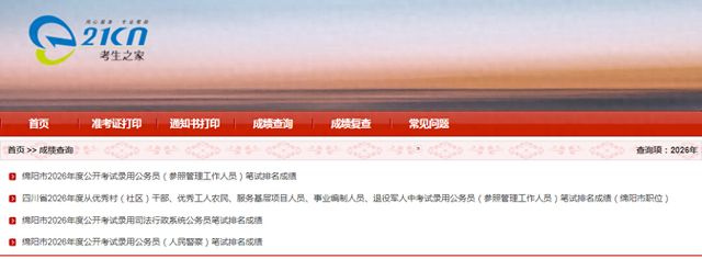 1月12日10点,2026年四川公务员笔试成绩排名第一个先出的地市是:绵阳