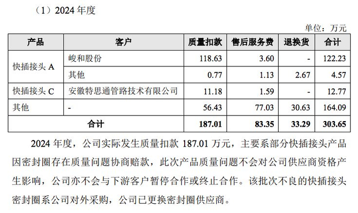 2024年弥富科技发生质量扣款187.01万元,包括向峻和股份销售快插接头发生质量扣款118.63万元,向安徽特思通管路技术有限公司销售快插接头发生质量扣款11.18万元。具体原因是部分快插接头产品密封圈存在质量问题,该批次不良的快插接头密封圈系公司对外采购,公司已更换密封圈供应商。弥富科技强调,此次产品质量问题不会对公司供应商资格产生影响,公司亦不会与下游客户暂停合作或终止合作。