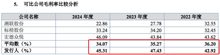 根据招股书显示,弥富科技2022年至2024年毛利率分别为42.92%、47.43%、45.31%、可比公司溯联股份、标榜股份、宏德众悦同期毛利率均值分别为36.2%、35.27%、34.07%。