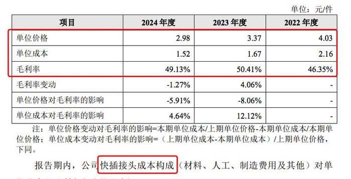 一轮回复中,弥富科技分产品进行了毛利率分析,以去年收入占比过半的快插接头产品为例,由于公司会在项目初期与客户约定产品单价及年降政策,以及客户采购规模增加议价能力相对增强、终端车型价格下降同时部分整车厂在成本端进一步要求供应商降价等因素影响,公司在逐年降低单位成本的同时,也逐年降低单位价格。