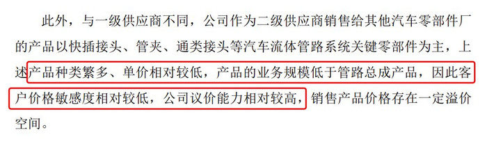 弥富科技表示,与一级供应商不同,公司作为二级供应商销售给其他汽车零部件厂的产品以快插接头、管夹、通类接头等汽车流体管路系统关键零部件为主,种类繁多、单价相对较低,产品的业务规模低于管路总成产品,因此客户价格敏感度相对较低,公司议价能力相对较高,销售产品价格存在一定溢价空间。