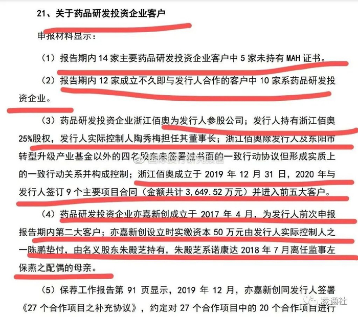 根据发行人申报材料,发行人 2019 年4 月申请在上交所科创板首发上市,同年 6 月上交所启动现场督导,同年 7 月发行人撤回申请,2020 年 4 月被上交所予以监管警示。前次申报时,发行人第二大客户亦嘉新创设立时由发行人时任监事配偶之母代持股份,实缴资本来自发行人实际控制人,且在设立后不久即与发行人签订27个项目订单,其中 20 个项目在发行人撤回申请后终止。亦嘉新创仅委托发行人进行药品研发。