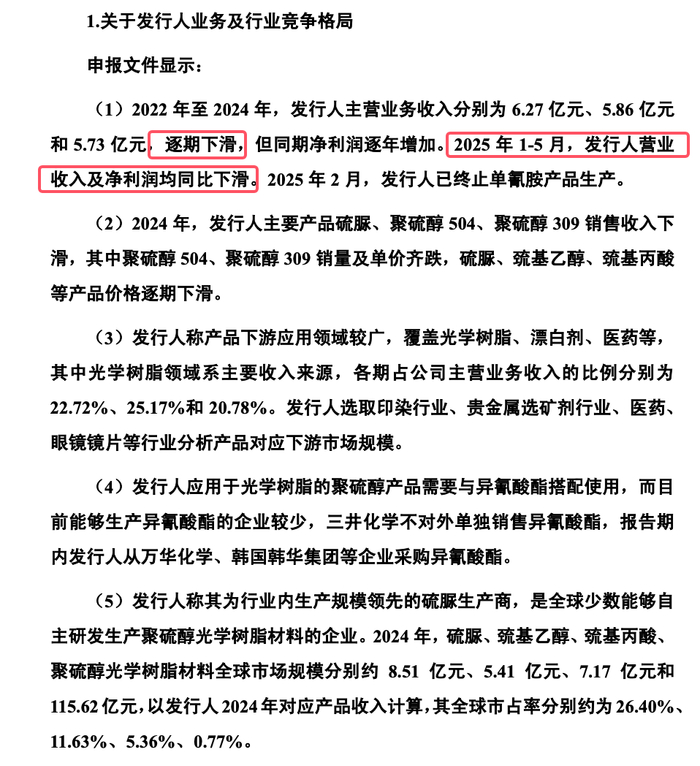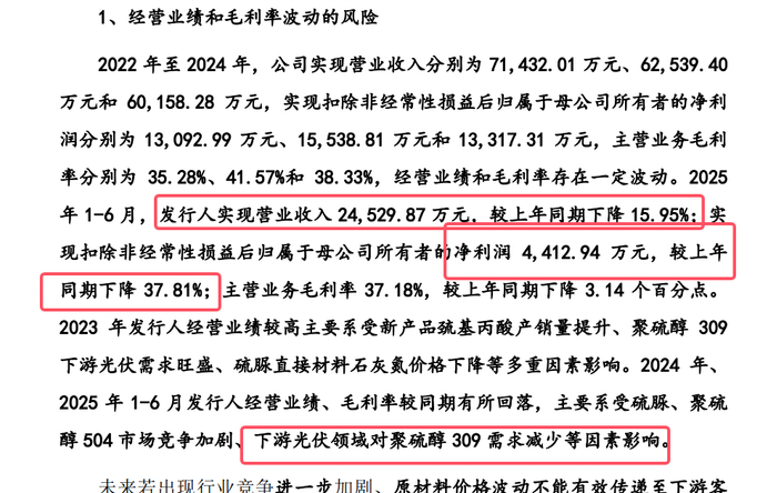 2 、不过公司的业绩看堪忧,主要是光伏行业影响下业绩持续下滑。公司表示2024 年、 2025 年 1-6 月发行人经营业绩、毛利率较同期有所回落,主要系受硫脲、聚硫 醇 504 市场竞争加剧、下游光伏领域对聚硫醇 309 需求减少等因素影响。 IPO问询也开门见山“2022 年至 2024 年,发行人主营业务收入分别为 6.27 亿元、5.86 亿元 和 5.73 亿元,逐期下滑,但同期净利润逐年增加。2025 年 1-5 月,发行人营业 收入及净利润均同比下滑。”2025 年 1-6 月业绩更见不得人,发行人实现营业收入 24,529.87 万元,较上年同期下降 15.95%;实 现扣除非经常性损益后归属于母公司所有者的净利润 4,412.94 万元,较上年 同期下降 37.81%;主营业务毛利率 37.18%,较上年同期下降 3.14 个百分点。
