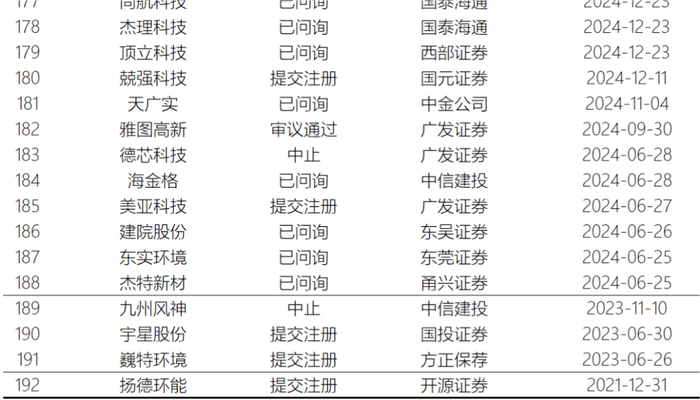 309家在审企业的排队时长均值为280天,中值为250天(约8个月)。其中,沪主板和深主板在审企业排队时间较长,中值分别为254天和264天;科创板和创业板企业的审核时长较短,中值分别为106天和81天;北交所企业的排队时长中值为253天,与主板较为接近。截至目前,排队时间最久的IPO企业为扬德环能(北交所),排队时间已经超过四年(1,521天)。