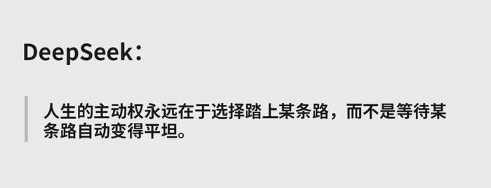 DeepSeek里就曾有言:人生的主动权永远在于选择踏上某条路,而不是等待某条路自动变得平坦。