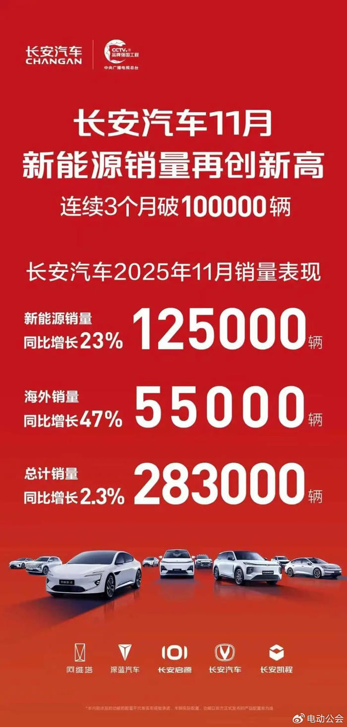 长安汽车2025年11月新能源销量为12.5万辆,同比增长23%,连续3个月突破10万辆大关。