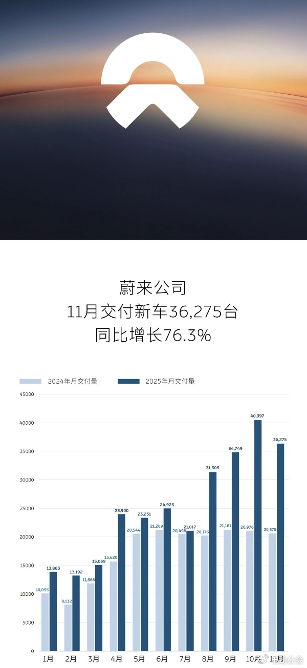 蔚来汽车11月新能源销量表现亮眼,同比增长76.3%,交付新车36,275台。自今年8月以来,蔚来汽车交付量已连续四个月超过3万台。