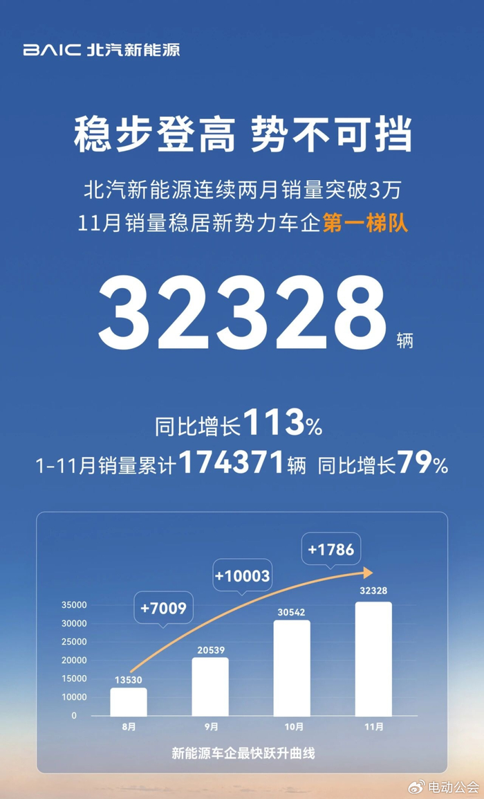 北汽新能源11月新能源销量为32,328辆,同比增长113%,创单月历史新高。其中,极狐品牌贡献25,394辆,同比增长128.32%,1-11月累计销量136,592辆,同比增长97.99%