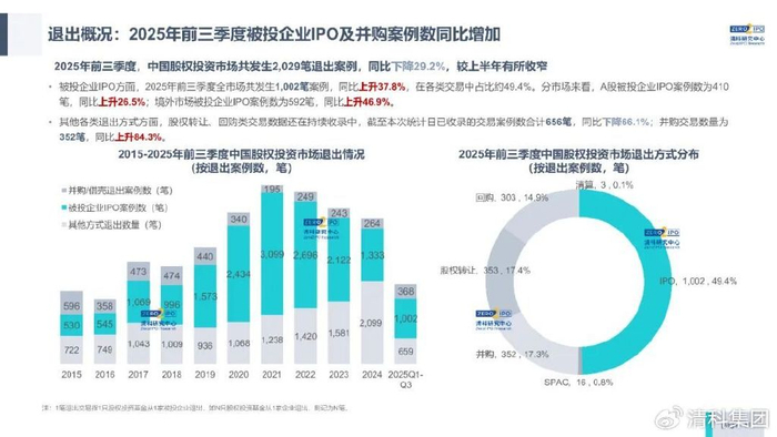 退出方面,在IPO及并购市场回暖推动下,被投企业IPO及并购退出案例数同比增加。据统计,2025年前三季度共发生2,029笔退出案例。其中被投企业IPO案例数为1,002笔,同比上升37.8%;并购退出案例数合352笔,同比上升84.3%。