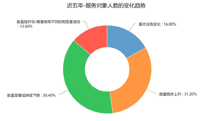 生源变化:1/3的机构表示服务对象人数稳步上升,1/3在显著或持续下降。