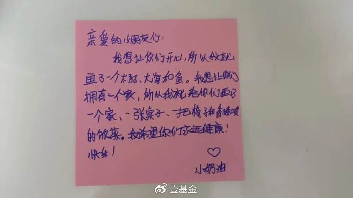 “亲爱的小朋友们,我想让你们开心,所以就画了一个太阳、大海和鱼。我想让你们拥有一个家,所以我就给你们画了一个家、一张桌子、一把椅子和香喷喷的饭菜。我希望你们永远健康、快乐!”