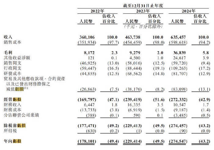 招股书显示,从2022年至2024年,博雷顿的收入分别约为3.6亿元、4.6亿元及6.4亿元;同期,净亏损分别约为1.78亿元、2.29亿元及2.75亿元,亏损呈现持续扩大的趋势,近三年合计亏损6.82亿元。同时,对应毛利率较低,近三个年度分别为2.3%、2%及5.8%。
