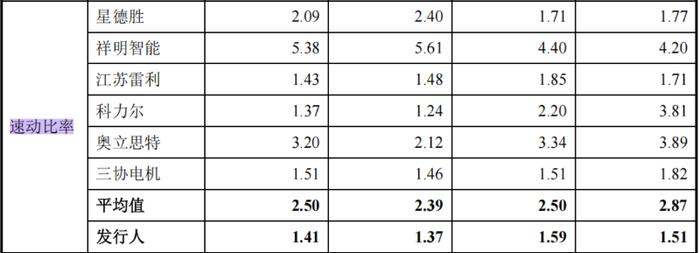 报告期内,晨光电机的速动比率分别为1.51次/年、1.59次/年、1.37次/年和1.41次/年,同期可比公司的速动比率均值分别为2.87次/年、2.5次/年、2.39次/年和2.5次/年。