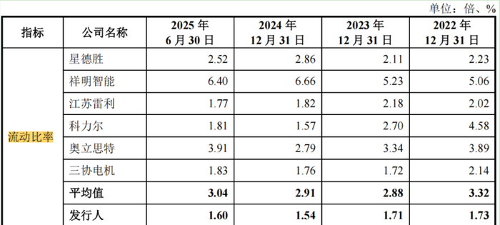 另外,值得注意的是,晨光电机的流动性比率也远落后于同行可比公司。报告期内,该公司的流动比率分别为1.73次/年、1.71次/年、1.54次/年和1.60次/年,同期可比公司的流动比率均值分别为3.32次/年、2.88次/年、2.91次/年和3.04次/年。
