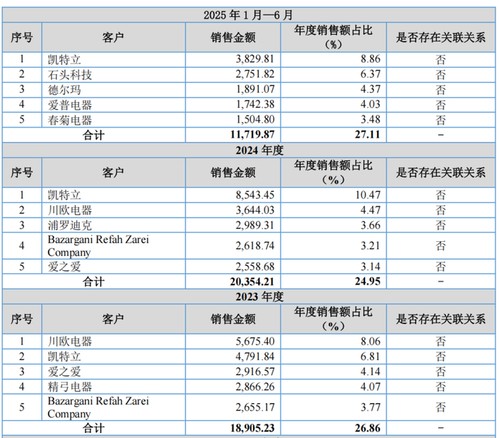 事实上,晨光电机未来业绩增长的可持续性令人担忧。报告期内,该公司的前五大客户变化较大。在2025年1-6月份,该公司的前五大客户按大小顺序分别为凯特立、石头科技、德尔玛、爱普电器和春菊电器;而在2024年,前述的五大客户中仅凯特立出现在前五大之列;在2023年的五大客户中,与2025年1-6月份相比,也仅有凯特立位列第二。