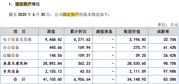 截至2025年6月30日,原力数字拥有的固定资产账面价值金额为3.41亿元,占当期非流动资产的比例分别为81%,占当期总资产的比例为33.8%,是总资产中占比最高的项目。