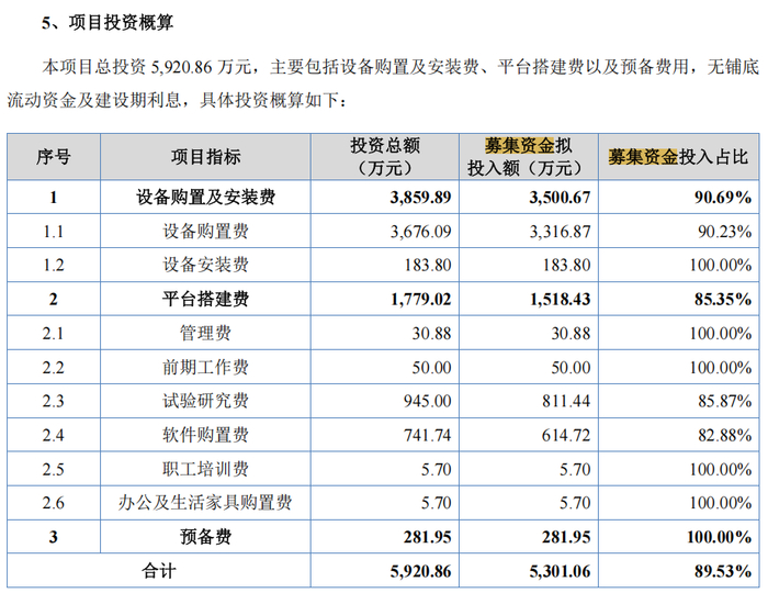 上述募投项目的资金中,有3500.67万元募集资金用于设备购置及安装费,占该募集资金的90.69%。