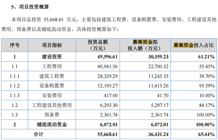 在上述项目的投资金额中,有3.06亿元募集资金用于建设投资,占总募集资金的61.21%,其中工程费用占比55.45%,安装费用占比10%。
